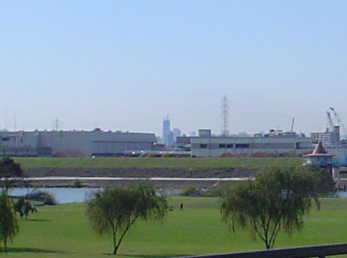 中央、東京スカイツイリー(新葛飾橋千葉側より)