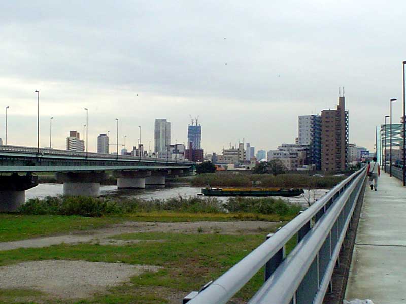 都と千葉県の間にかかる「新葛飾橋」でふと振り返り、スカイツリーを探す。
